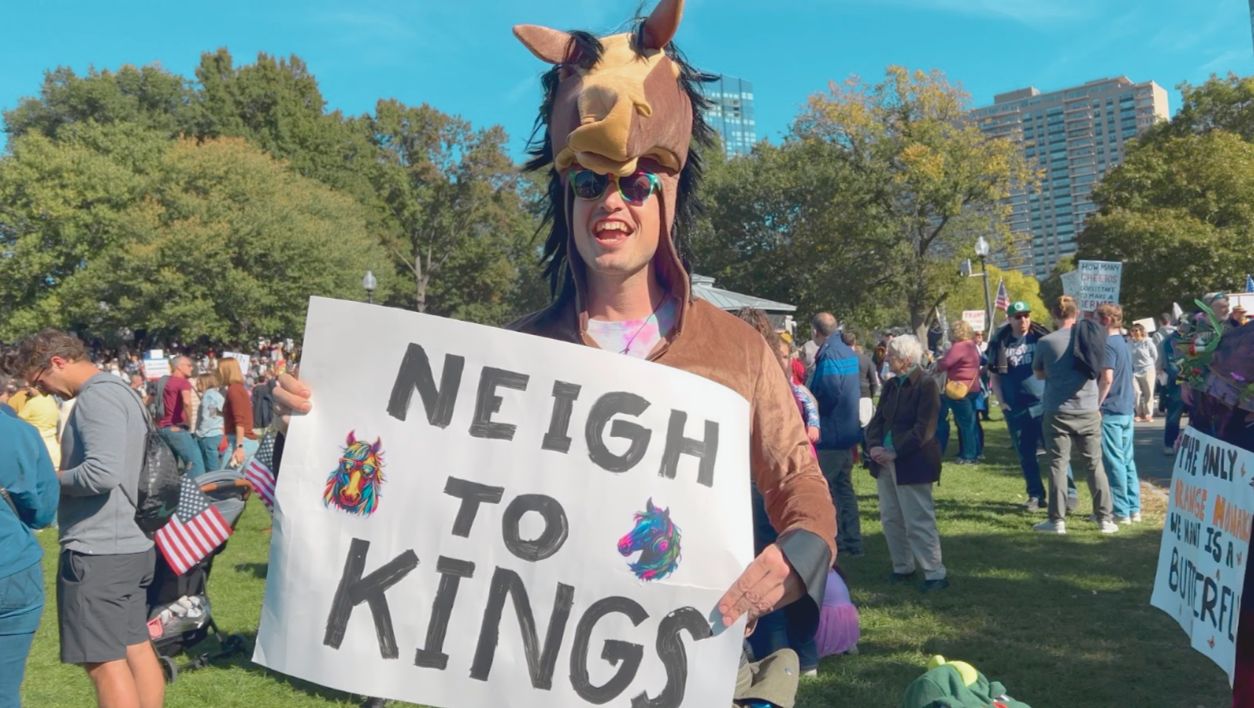 Man wearing horse costume: “You know, you gotta have whimsy, you gotta have fun. We're peaceful. loving protesters here. We love America. We love free speech. There's no hate. There's no animosity or violence. … You don't defeat hate and violence with hate and violence. You defeat it with love. … And yeah, neigh to kings, neigh to tyranny.” And he adds a very convincing whinny!